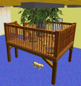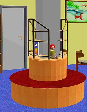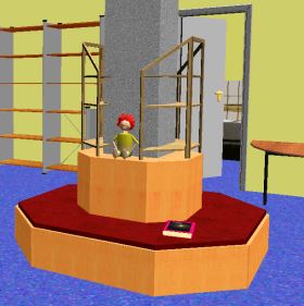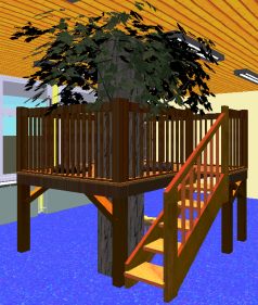 Das Baumhaus weist eine Grundfläche von zwei mal zwei Metern auf. Eine schmale Treppe hinter der Säule für zum Baumhaus hinauf. Stilgerecht lässt sich das Baumhaus mit Sitzkissen ausrüsten. Der Raum unterhalb des Baumhauses bietet sich zur weiteren Gestaltung an, z.B. Nischen als Rückzugräume zum ungestörten Lesen.
