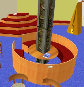 Runde Sitzbank mit innen liegender Rückenlehne. Oberhalb der Rückenlehne ist ein Miniregal integriert, das zur allgemeinen Gestaltung oder zur Präsentation neuer Bücher dienen kann. Sechs bis acht Kinder sollten Platz finden.