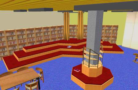 Blick auf die Sitzstufen mit dem Lesezelt. Der Betrachter befindet sich links neben der Säule.