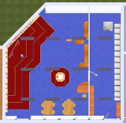 Der Grundriss. Die schwarzen, regelmäßig angeordneten Streifen stellen die Deckenbeleuchtung dar.