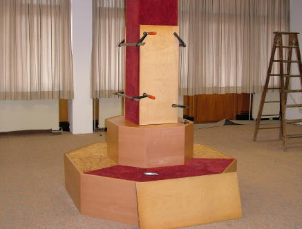 Als nächstes ist die Gestaltung der Mittelsäule an der Reihe. Im Gegensatz zum Entwurf wir sie von einer achteckigen Sitzbank umgeben, die sich stilistisch glatter in den Entwurf einfügt. Der dann noch sichtbare Teil der Säule erhält roten Teppichboden als Verkleidung.
