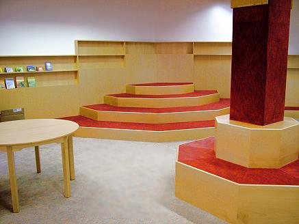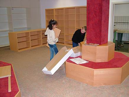 Mitte Februar 2005 ist es so weit: Der Leseberg ist fertig aufgebaut. Er ist leicht als dominierendes Element des Raumes zu erkennen. Als nächstes erhalten die Sitzflächen einen Überzug aus weinrotem Teppichboden.