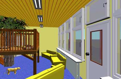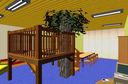 Der Blickfang der "Urwaldbibliothek" ist das Baumhaus. Weiterführende Informationen dazu und weitere Abbildungen vom Baumhaus auch unter Detaillösungen für die Mittelsäule.