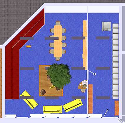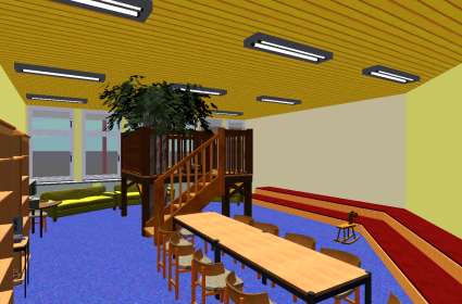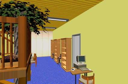 Hier nun ein Blick auf die Regalwand. In diesem Entwurf ist die Hörbuchecke in das Buchregal integriert. Rechts ist der Rechner für die Ausleihe zu erkennen.