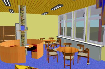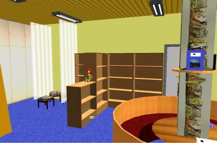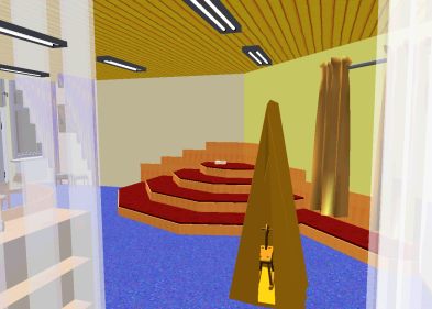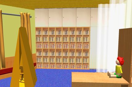 Blick aus dem Inneren des weißen Lesezeltes auf den "Leseberg". Im Vordergrund ist ein Indianerzelt angedeutet. Links schimmern die Bücherregale durch den Vorhang. Im Hintergrund ist durch den Vorhang ein stufiges Lesezelt zu erkennen.