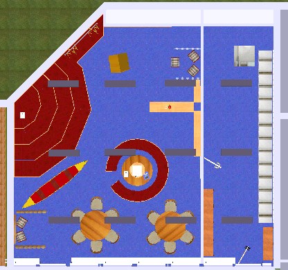 Der Grundriss. Die dunkelgrauen, regelmäßig angeordneten Streifen stellen die Deckenbeleuchtung dar.