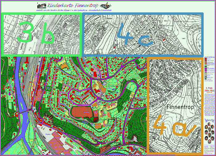 7.1 AG Kinderkarte von Finnentrop 2003/04 Im Schuljahr 2003/04 stehen uns im Computerraum zwölf Rechner mit geigneter Soft- und Hardware zur Verfügung. Zwei Arbeitsgemeinschaften bemühen sich um die Erweiterung des Finnentroper Kinderkarte. Die AG der Klasse 4 c arbeitet an der Norderweiterung, die AG der Klasse 4 aan der Osterweiterung. Die Arbeitsbereiche der AGs sind in der untenstehenden Karte abgebildet. Der noch ausstehende Nordwestbereich wird von einer noch zu bildenden AG im zweiten Schulhalbjahr bearbeitet werden. ![]() Die Kartographierung des Neubaugebietes erwies sich als so komplex, dass die Aufgaben auf drei AGs aufgeteilt werden mussten. Die folgende Karte zeigt die Einteilung der Arbeitsgruppe, wobei jede Farbe einer AG entspricht. ![]() Die wichtigsten FAQs zur Karten-AG 2003/04Was machen wir?Unsere Schulkarte von Finnentrop nach Norden und Osten erweitern. Überwiegend Arbeit am PC (eine Schulstunde). Einzelne Exkursionen (bis zu zwei Schulstunden). Für Kinder, die mit viel Ausdauer über lange Zeit an einem Problem arbeiten können, die Interesse an Geographie haben und am PC andere Dinge als "Spielen" lernen möchten. Jedes Kind hat einen PC. Trotzdem ist eine arbeitsteilige Absprache und zwischenzeitliche Kooperation in Gruppen zu zweit oder zu dritt erforderlich. Mit einem Graphik-Programm umgehen. Linien zeichnen. Flächen einfärben. Text einfügen. Text schattieren und drehen. Kartensymbole einfügen. Fehler korrigieren. Im Netzwerk an- und abmelden. Dateien öffnen. Dateien speichern. Ordner und Ordnungsstrukturen. Dateien im Netzwerk bewegen. Dateien einem Nachbarrechner zur Verfügung stellen. Und vieles mehr. Topologie des Heimatortes kennen lernen. Wirklichkeit in Karte umsetzen können. Karte für die Nutzung in der Wirklichkeit interpretieren können. Thematische Darstellungen verstehen lernen. Die aktuellste und genaueste Karte des Ortes Finnentrop. |